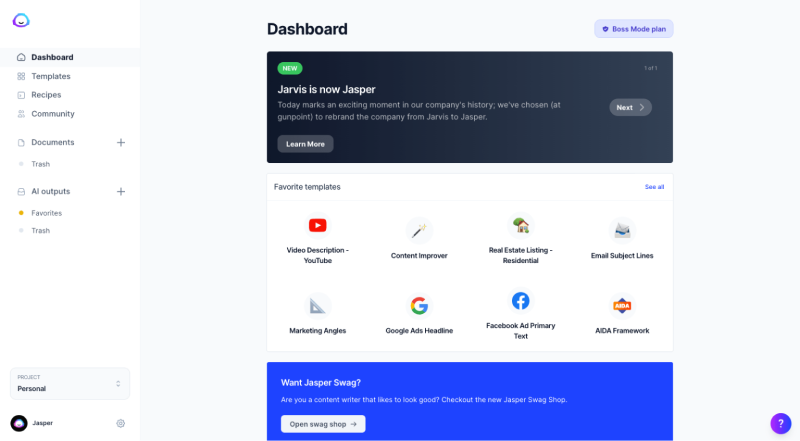 - 长篇文章编辑器。Jasper称之为Boss Mode,可以让你用AI输出写作完整的文档