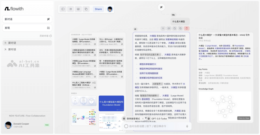 - 节点式交互:用户可以在一个画布上创建多个节点,每个节点代表一个独立的问题或主题,围绕节点进行信息的搜索和整合,实现多线程处理。